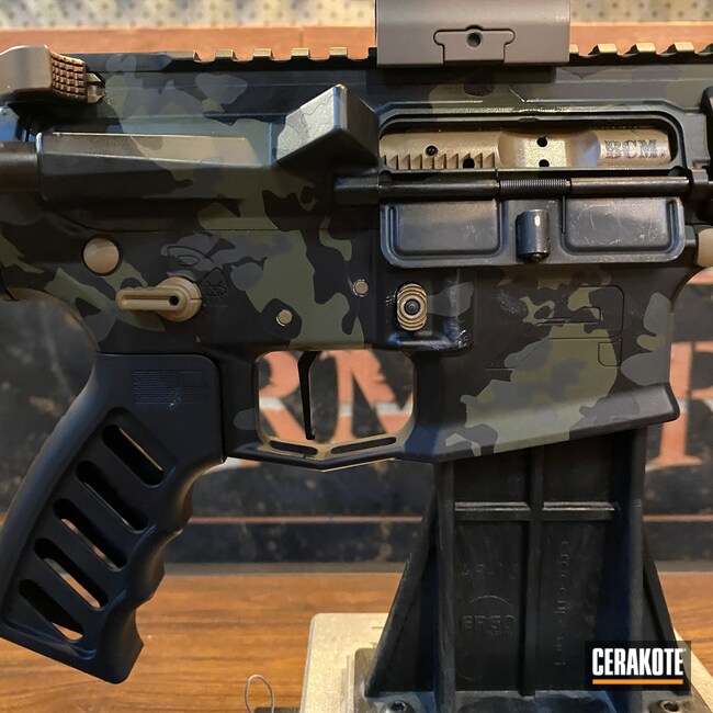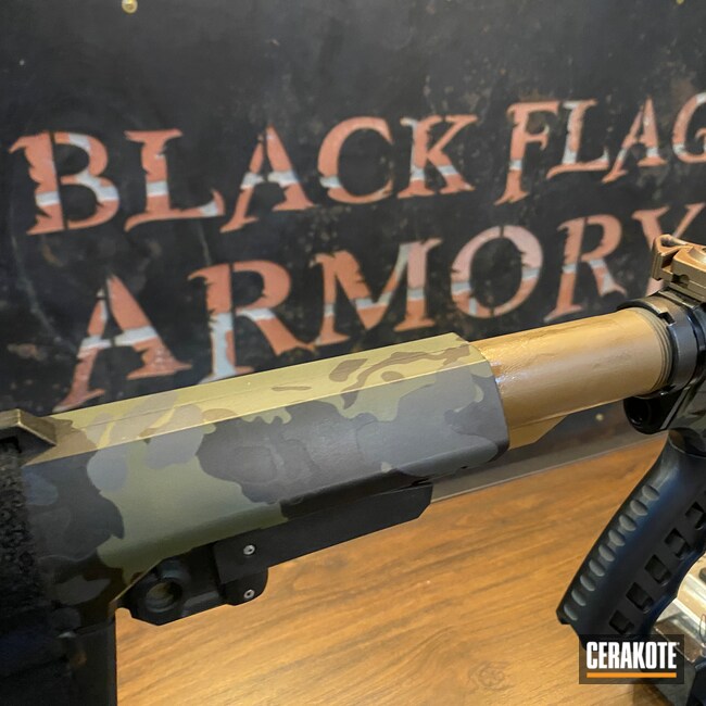 This customer came in and wanted to dark Multicam style pattern with contrast on the small parts. We coated the large components in the Multicam style using black, grey, and dark green, while the small parts including the barrel and buffer tube are coated in a medium brown to match the "tanodize" color as close as we can.