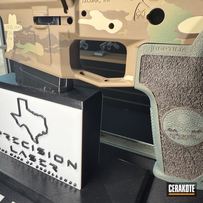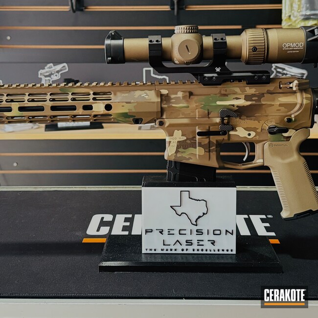 The completed Cerakote project features a Multicam pattern with a mix of colors: FS Brown Sand as the base, Highland Green for depth, Coyote Tan for a sandy touch, Plum Brown for a unique accent, and Glock FDE to tie everything together. This color combination is not only visually appealing but also practical for outdoor and tactical use.